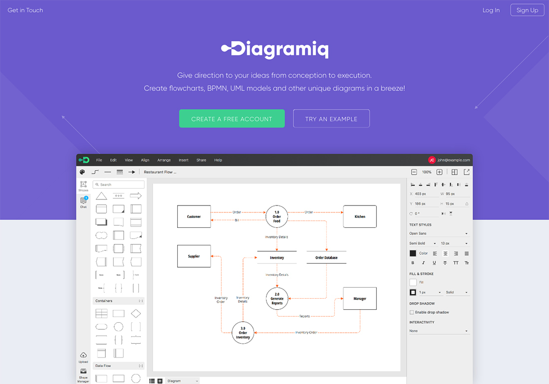 📌 DIAGRAMIQ est un outil gratuit en ligne permettant de créer diagrammes, Userflows, Flowcharts, etc… Ce qui est vraiment sympa c’est l’utilisation des points d’ancrage, comme on pourrait le retrouver sur OMNIGRAFFLE par exemple.