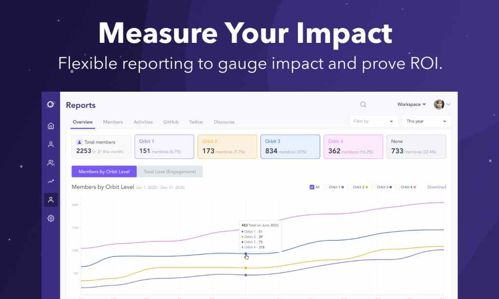 ORBIT vous donne une vue complète de votre communauté, quel que soit l’endroit où vos membres s’engagent, et vous équipe d’outils pour engager de manière proactive les membres et les segments clés. ORBIT est en somme un dashboard pour votre communauté, débloquant de nouvelles connaissances sur les membres les plus actifs et les plus influents, les canaux les plus importants et les domaines dans lesquels ils peuvent améliorer leurs programmes communautaires. Il en résulte une meilleure expérience pour les membres de la communauté ainsi qu’une meilleure compréhension du ROI pour les créateurs.