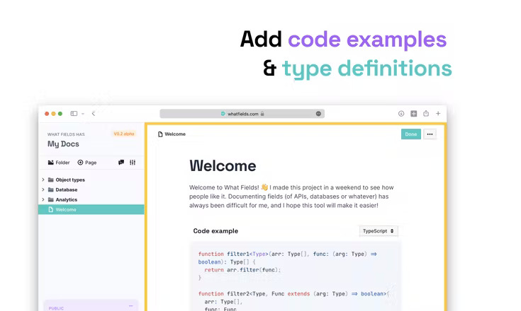 📌 WHATFIELDS est un outil simple pour créer des docs pour vos API, bases de données, ou tout autre documentation en ligne.